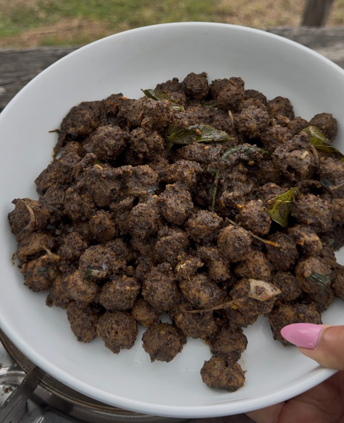 මද වේලාවක් කවලම් කරමින් උයාගෙන එයට අප බැදගත් තුනපහ සහ මිරිස්කුඩු මිශ්රණය දමා හොඳින් සෝයාමීට් වල තැවරෙන ලෙස කවලම් කරගන්ට. ඒ සමගම අප සාදාගත් කලුපොල් මිශ්රණයෙන්ද තමා හොඳින් කවලම් කරගන්ට. ඉන්පසු සාමාන්ය ගින්දරේ භාජනය වසා පිසෙන්නට හරින්ට. මදවේලාවකින් පියන ඇර බලා නැවත හොඳින් මිශ්ර කර අප සාදාගත් පොල්කිරි කෝප්පය එකතු කරන්ට. ඉන්පසු හොඳින් කවලම් කර ගින්දර මදක් වැඩිකර පිසෙන්නට හරින්ට. ගින්දර ගොඩක් වැඩි නොකර තබාගන්ට.