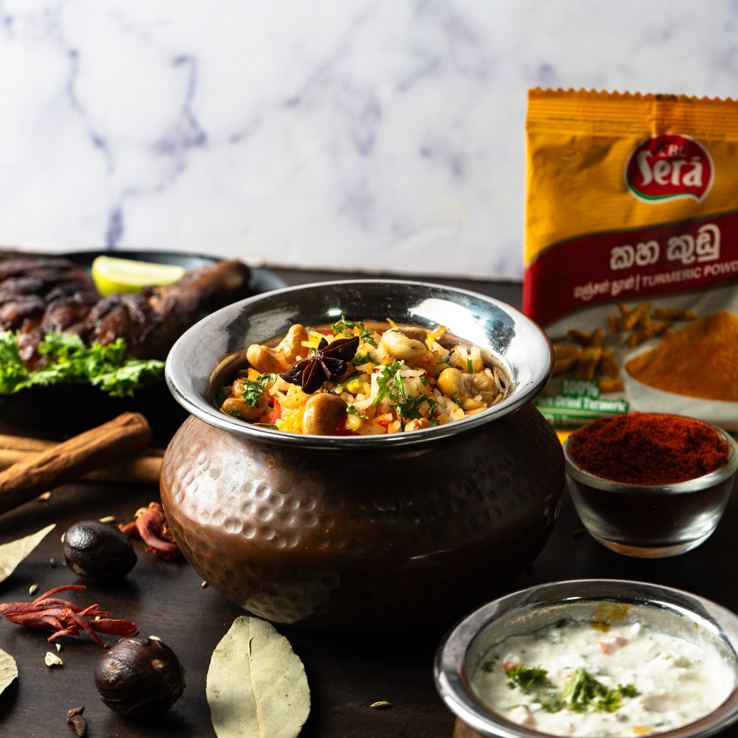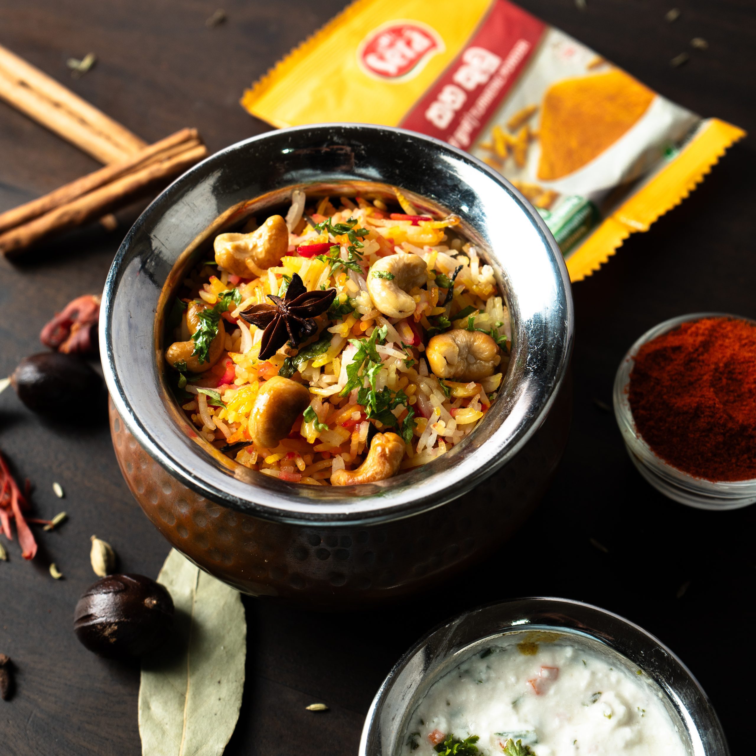 ගී තවරාගත් වෙනම බඳුනක් ගෙන ඒකට පිසගත් මස් සහ අල මිශ්රණයෙන් කොටසක් තට්ටුවක් විදියට අතුර ගන්න. ඒකට උඩින් බත් තට්ටුවක්, බැදගත් ළූණු, කොත්තමල්ලි කොළ, දෙහි සහ තක්කාලි පෙති අතුරා එයට උඩින් ඉතිරි මස් මිශ්රණය නැවත අතුරා පෙර පරිදිම බත් තට්ටුවක් එක් කරගන්න.