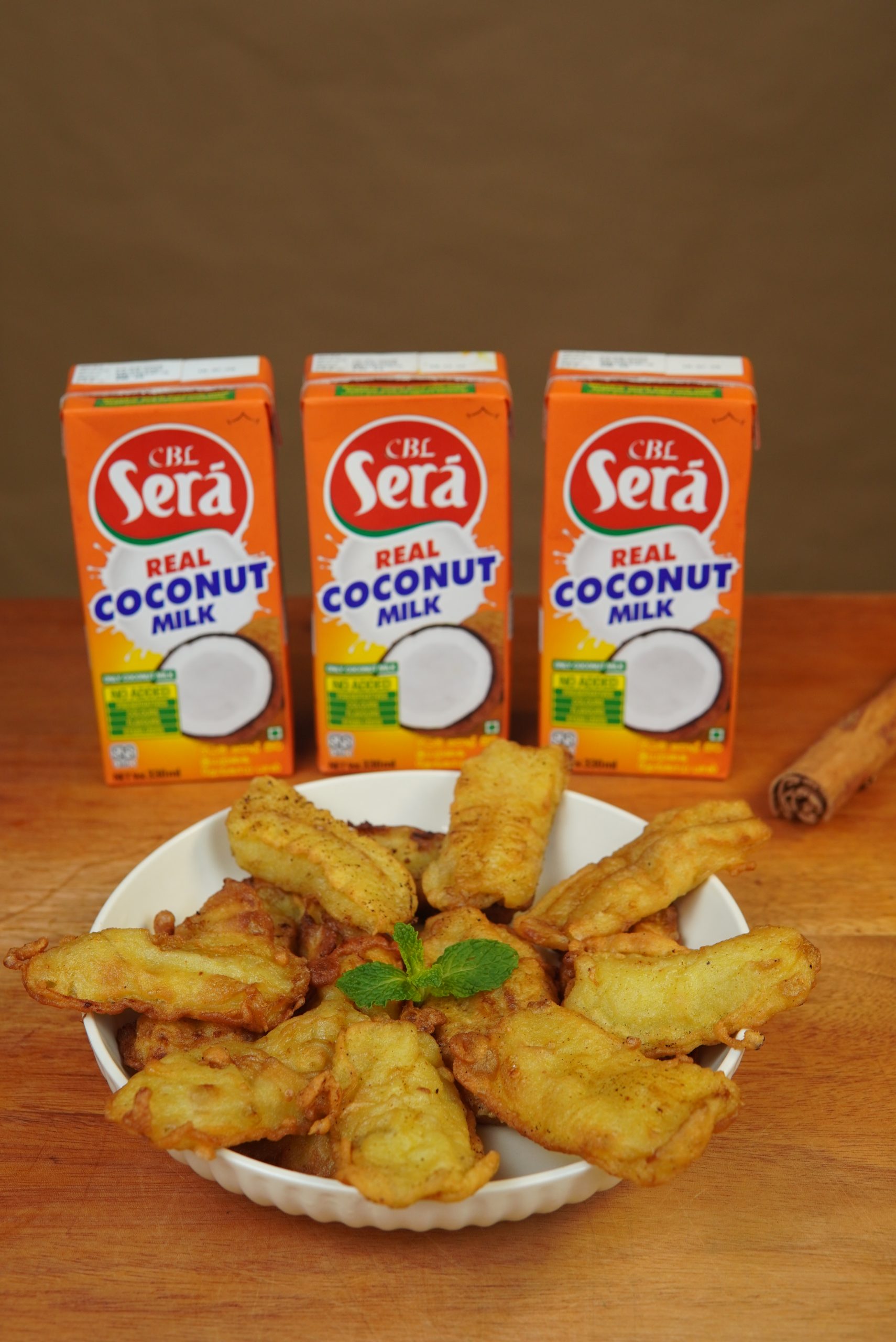 In a bowl, mix flour, coconut milk, sugar, cinnamon, and nutmeg to form a batter.