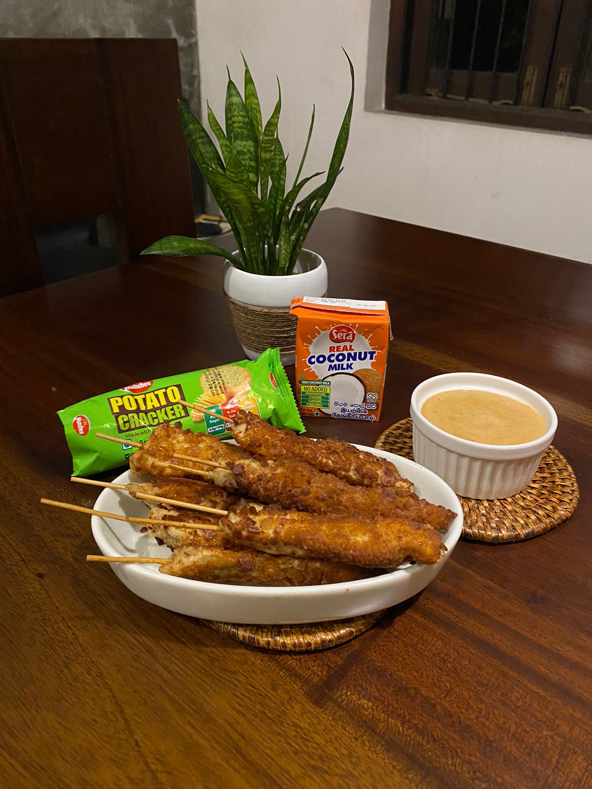 Crunchy chicken skewers served with creamy coconut milk and peanut sauce