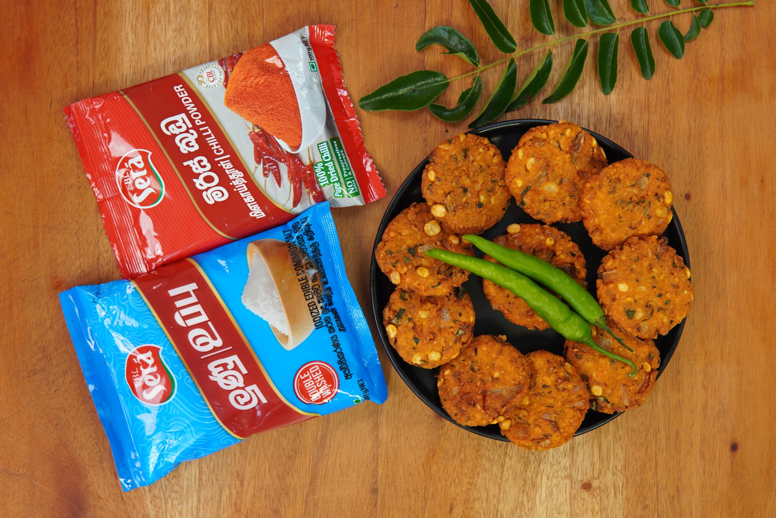 Mix the ground chickpeas with onions, green chilies, ginger, curry leaves, cumin seeds, chili powder, and salt.